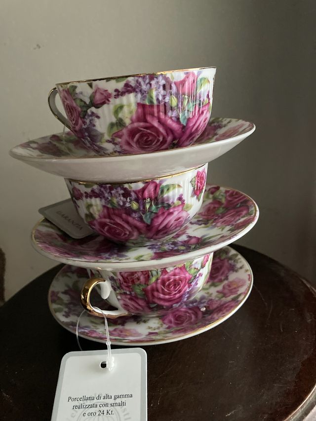 tris tazzine da tea con il piattino coordinato in porcellana con rose