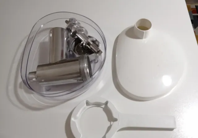 Accessori per Kenwood Chef per tritare la carne. - Componenti in metallo lucido. - Contenitore trasparente per riporre i pezzi. - Accessorio bianco per il montaggio.