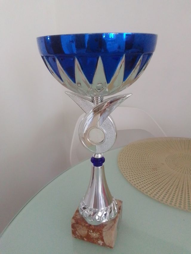 Trofeo o coppa, ideale per premiazioni. - Design elegante con dettagli argentati. - Coppa blu brillante. - Base in marmo. 34 x 16 cm