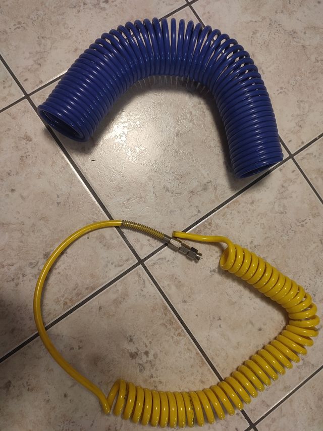 Dettagli del prodottoSet di tubi flessibili per aria compressa, uno blu e uno giallo. Ideali per collegamenti pneumatici.