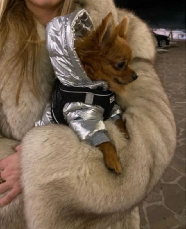 Dettagli del prodottoTuta da montagna argentata con cappuccio, pensata per cani di piccola taglia. Il design imbottito offre calore e protezione.