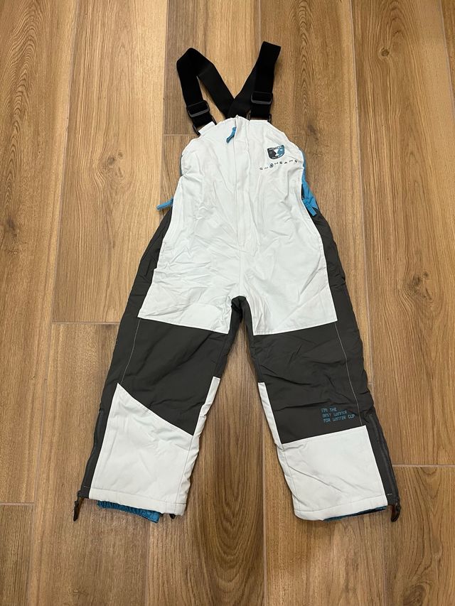 Dettagli del prodottoSalopette/tuta da neve di colore bianco con particolari azzurri e grigi, bretelle regolabili