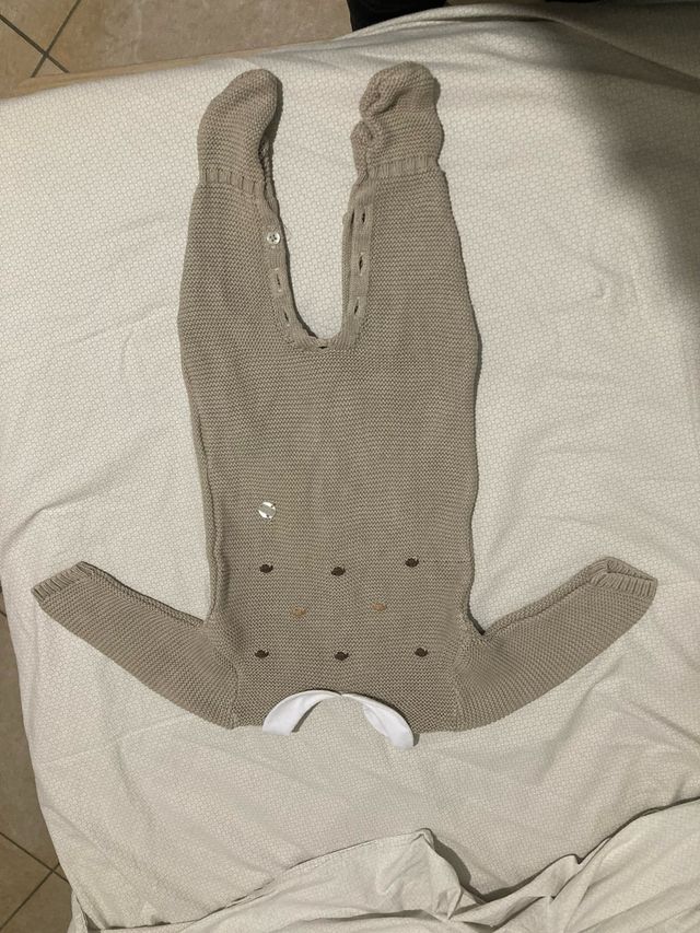 Morbida tutina in maglia per neonato, colore beige. - Chiusura con bottoncini sul davanti. - Piedini integrati. - Decorazioni a forma di piccoli bottoncini marroni sul davanti.