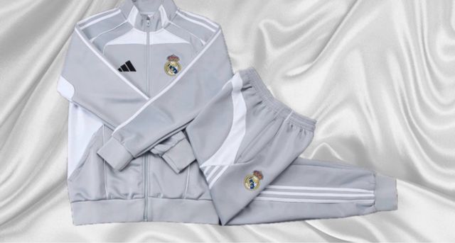 - Pantaloni sportivi grigi con strisce Adidas e stemma del Real Madrid.