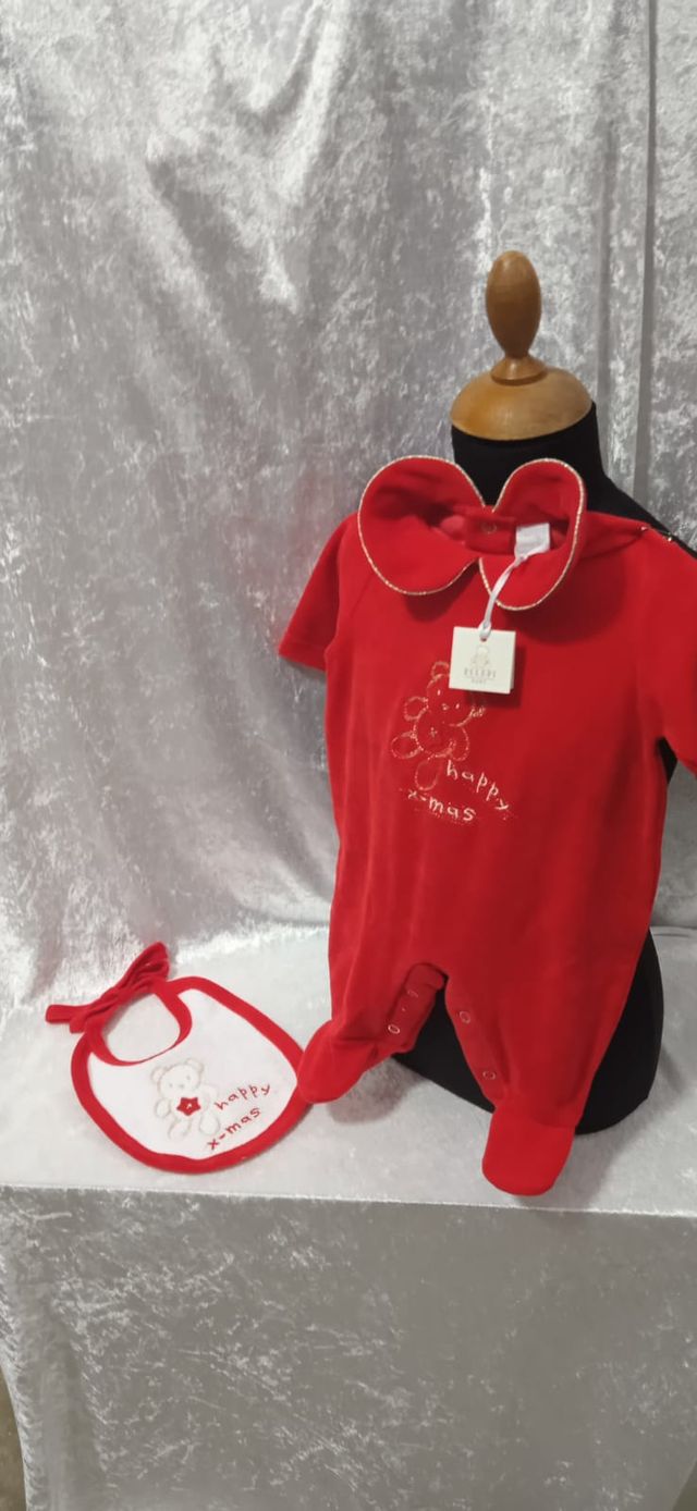Tutina in ciniglia rosso, 0-6 mesi con bavaglino abbinato.