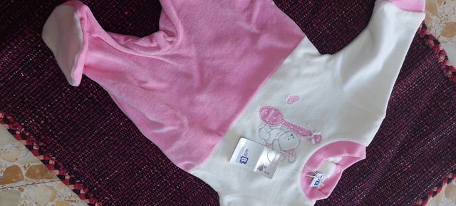 Morbida tutina in ciniglia per neonata, taglia 0/3 mesi. Perfetta per i primi mesi. - Colore: bianco e rosa. - Dettagli con orsetto e sonaglio. - Chiusura con bottoncini. - Piedini inclusi.