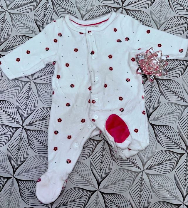 Morbida tutina in ciniglia per neonata, perfetta per i primi mesi. - Fantasia con fiori rossi e coccinelle. - Apertura frontale con bottoncini. - Piedini inclusi.