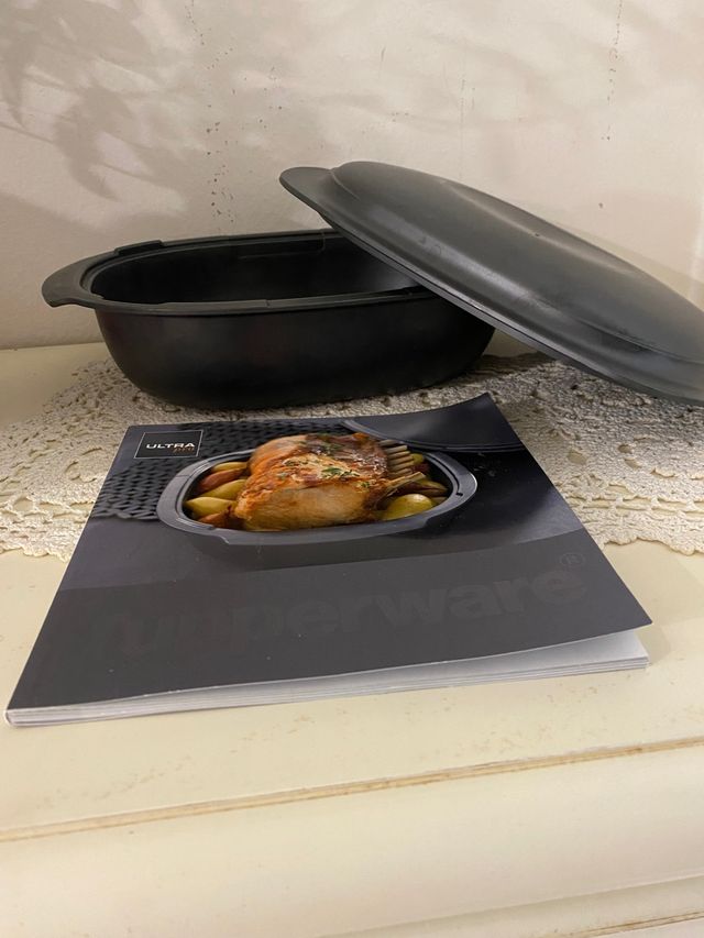 Ultra Pro Tupperware da 2lt con ricettario per cottura in microonde. Ci sono segni di usura all’interno del contenitore. Misura 30x22,5x8.