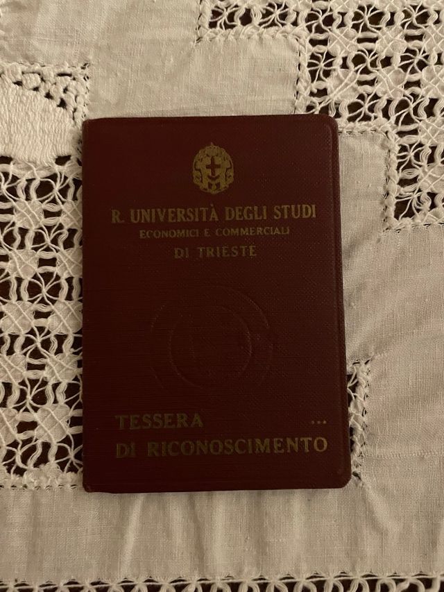 Tessera di riconoscimento della R. Università degli Studi Economici e Commerciali di Trieste, primo anno di immatricolazione e frequenza 1931/1932, in tessuto rigido originale, completa di fotografia autentica, firme e bolli per gli anni accademici 1931–1935.