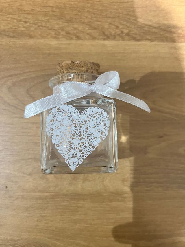 Rimanenza di bomboniere. Vasetti in vetro ideali per confezionare bomboniere. In vetro con tappo di sughero e fiocco bianco in raso. Totale 26 pz Misure 4x4