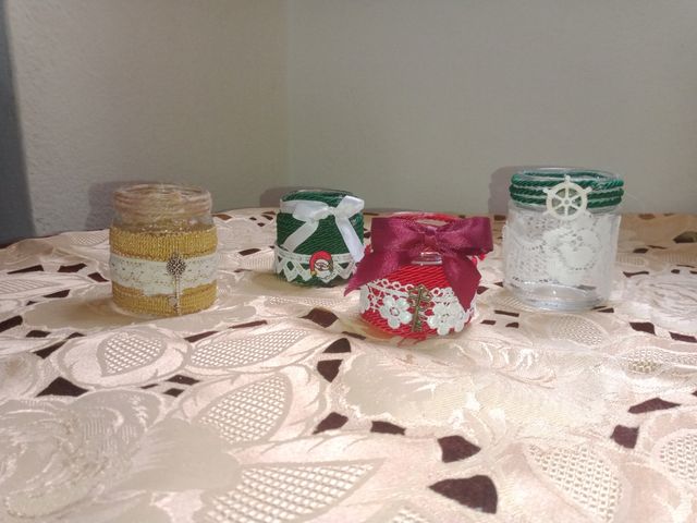 Dettagli del prodottoBellissimi portacandele, perfetti per creare un'atmosfera magica durante le feste. Sono realizzati con vasetti di vetro decorati con pizzo, nastri
