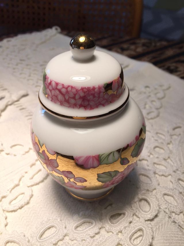 Dettagli del prodottoVasetto con coperchio in porcellana italiana, motivo a fiori vari rosa su fondo d’oro, prima qualità. Misura: altezza (con coperchio) cm 11, larghezza massima cm 7. Assolutamente Si nuovo. Non si accettano resi.