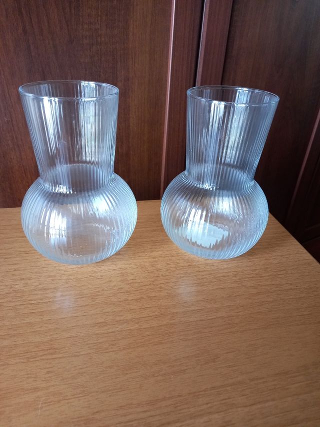 n. 2 vasi da fiori trasparenti con motivo a righe sottili, alti circa 18 cm.