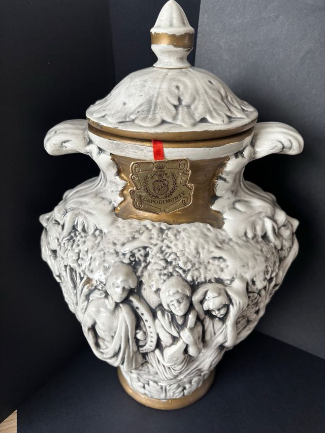Dettagli del prodottoElegante vaso Capodimonte antico, finemente decorato con scene in rilievo e dettagli dorati. Un pezzo d'arte che aggiunge un tocco di classe a qualsiasi ambiente.