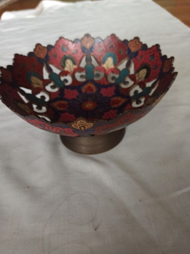 bellissimo vaso in metallo lavorato. splendidi colori.