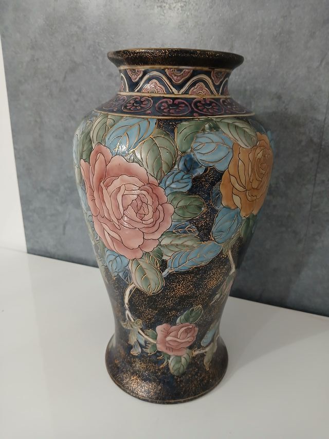 Vaso Cinese Orientale in Ceramica con Fiori Rose Vintage 30 cm In buone condizioni come da foto