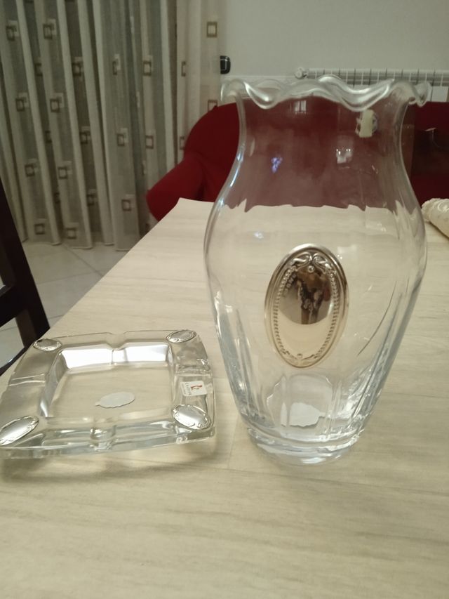 vaso in cristallo con piastra in argento abbinato ad un elegante posacenere