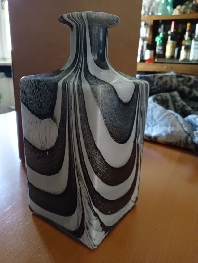 vaso da fiori con decoro sfumato bianco/nero. altezza totale 22 cm. base quadrata (lato 20cm). Presenta una piccola malfattura di fabbrica all'imboccatura.