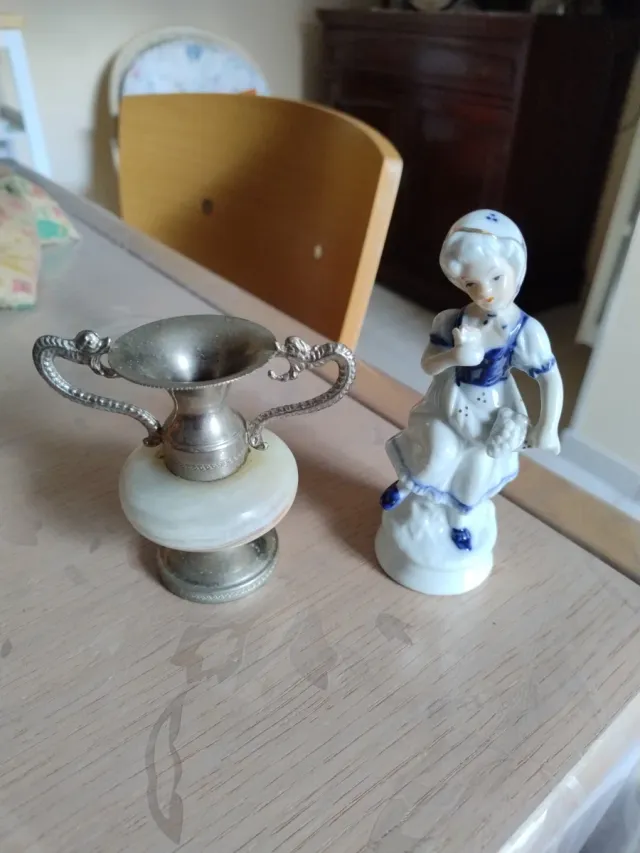 Delizioso set di soprammobili composto da un vasetto in onice (cm 9), statuina donna (cm 13)
