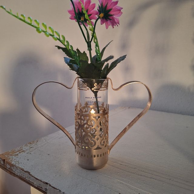 Dettagli del prodottoBellissimo vasetto in vetro e argento, con supporto argento antichizzato, realizzato da Paola Navone ( Egizia). Confezionato nella scatola originale, con vaso in vetro di scorta. Misure: 14x4x11h