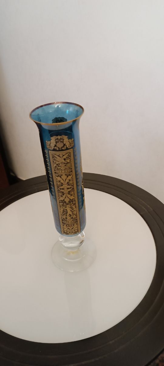 Dettagli del prodottoAlto cm 26, con diametro superiore di cm 6,5 e quello della base di cm. 8. Decorato con tecnica mista nel colore oro antico tenue e bordo dipinto color oro. Misure del prodotto