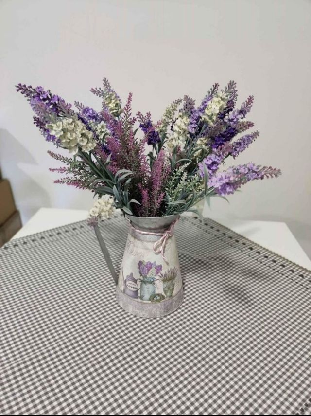 Dettagli del prodottoVaso di latta linea Shabby Chic con fiori di lavanda finti in diverse tonalità di viola, lilla e bianco. Fa molta scena dal vivo! il vaso è alto 23 cm e raggiunge 50cm circa con i fiori. (Sono disponibili anche un vassoio e un altro vaso della stessa linea).