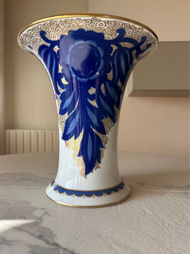 Vaso in porcellana altamente decorativo con disegni di uva e cunieform in oro opaco e dettagli di flora e fauna in blu cobalto e cielo su fondo bianco. Con il marchio "Rosari 324B, Rosenthal e Belb-Baviera". Ha solo un piccolo punto che manca di colore .