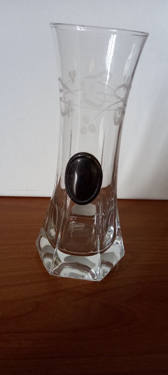 vasetto in vetro trasparente, alto circa 14,5 cm, con decorazione in argento 925 sul davanti.