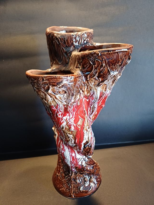 Dettagli del prodottoSplendido vaso in ceramica artistica smaltata VALLAURIS a 3 bocche collegate in un unico corpo.Pezzo unico e particolare nel suo genere. Produzione anni 50/70 Costa Azzurra. La bocca più alta misura 28 cm. la media 26 cm e la più bassa 23 cm. Condizioni eccellenti.