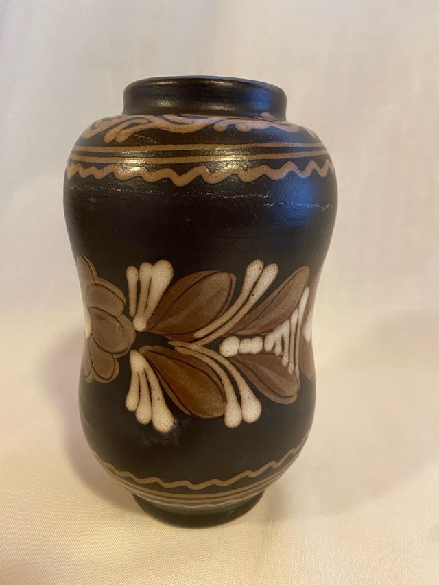 Questo vaso retrò è stato realizzato e dipinto a mano con motivi floreali stilizzati beige e marrone chiaro su base color cioccolato utilizzando tecniche popolari tradizionali in aggiunta a elementi di design moderno. Altezza 15,5 cm. I colori e le forme sono equilibrati e proporzionati.