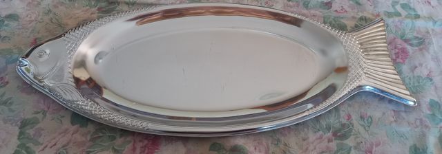Simpatico vassoio in leggero acciaio lucido a forma di pesce, qualche riga sulla zona piatto ma buone condizioni generali. Dimensioni circa 20x46 cm. Usato poco.