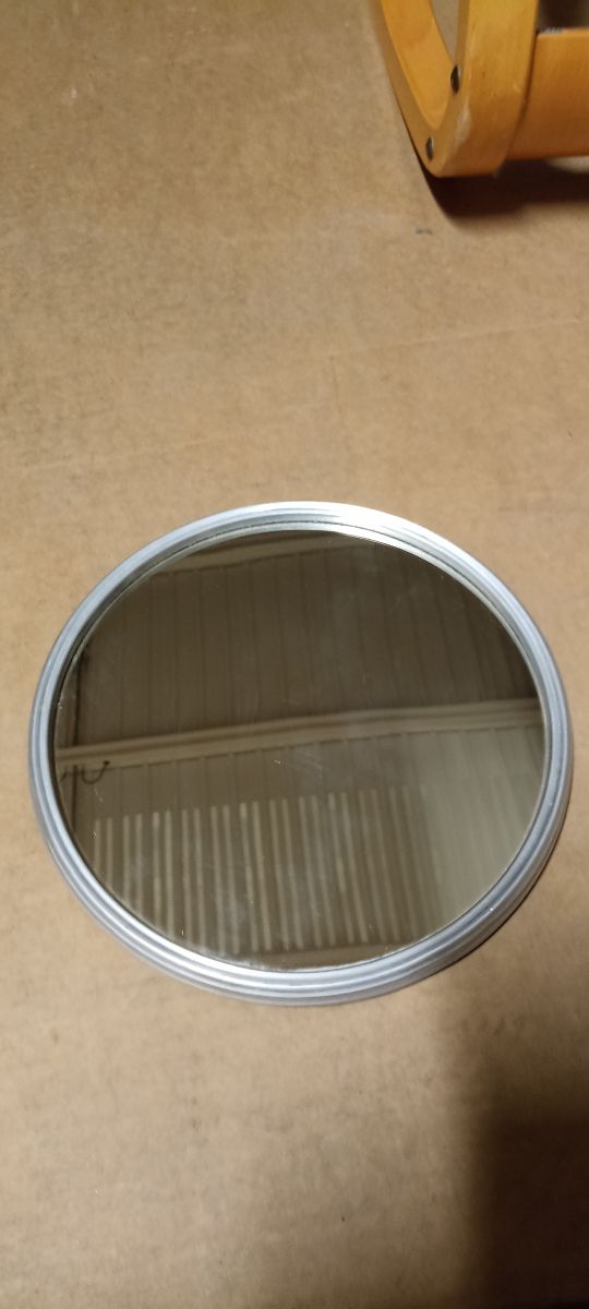 vassoio a specchio con cornice alluminio e fondo in legno . anni 50. diametro cm 28.