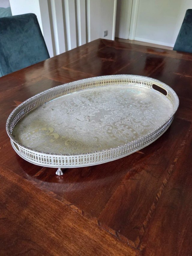 Elegante vassoio antico con finiture decorative. Ideale per servire o come pezzo d'arredo.