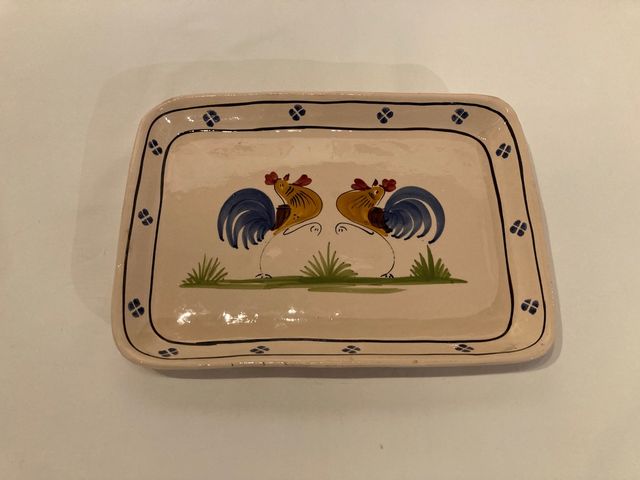 Vassoio in terracotta pugliese,dipinto a mano, con tipico decoro del galletto. La forma è rettangolare e le condizioni perfette.