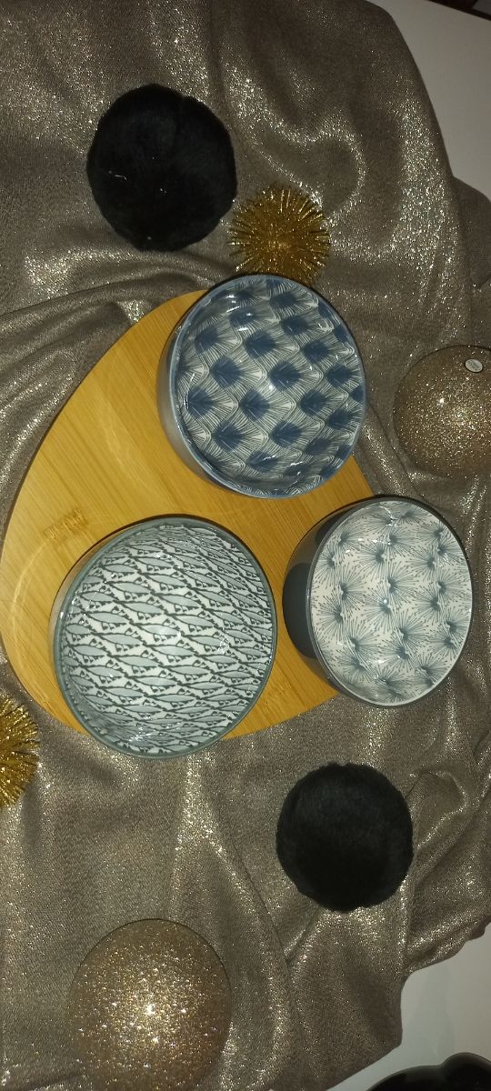 ciotoline in maiolica ×3 e vassoio in bambù