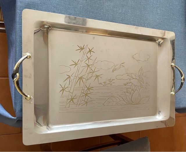 Vassoio da portata in acciaio inox. Decorazione in color oro