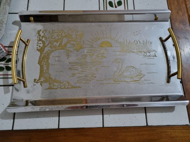 Vassoio in acciaio con decorazioni dorate (paesaggio). Senza difetti, deve solo essere lucidato