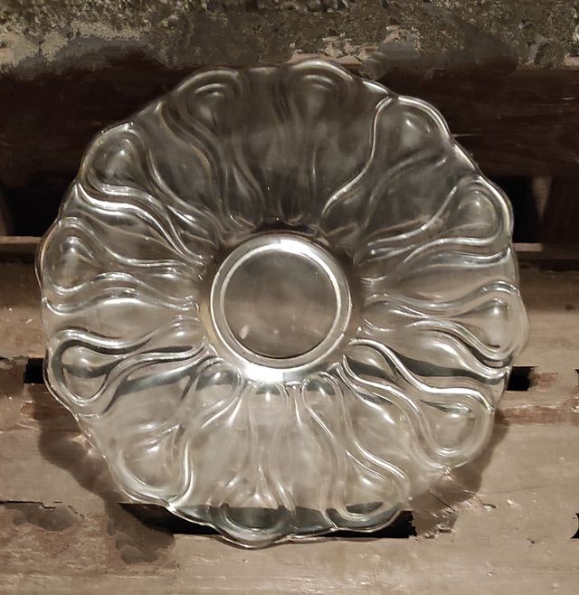 Dettagli del prodottoPiatto/Vassoio/Portafrutta in pesante vetro la forma di fiore, lavorato, trasparente.