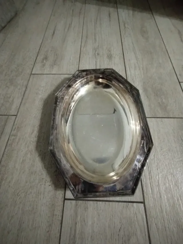 Elegante vassoio in argento placcato Calegaro. Perfetto per servire. - Design ottagonale con bordo rialzato. - Superficie interna ovale lucida.