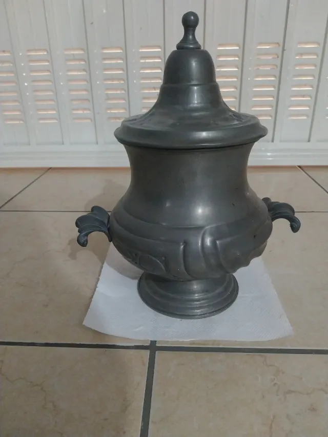 Dettagli del prodottoAntica biscotteria in peltro con coperchio e manici decorati. Un pezzo d'arredo dal fascino vintage.