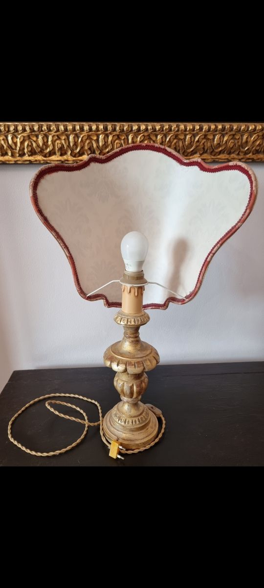 Dettagli del prodottoVecchia lampada da tavolo con paralume in tessuto damascato, base in legno dorato diam. 15 cm. Misure del prodotto