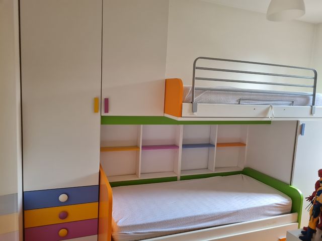 Letto sotto non fissato alla struttura, quidi si può spostare, con cassettoni contenitivi. Letto sopra con meccanismo per rifacimento letto.