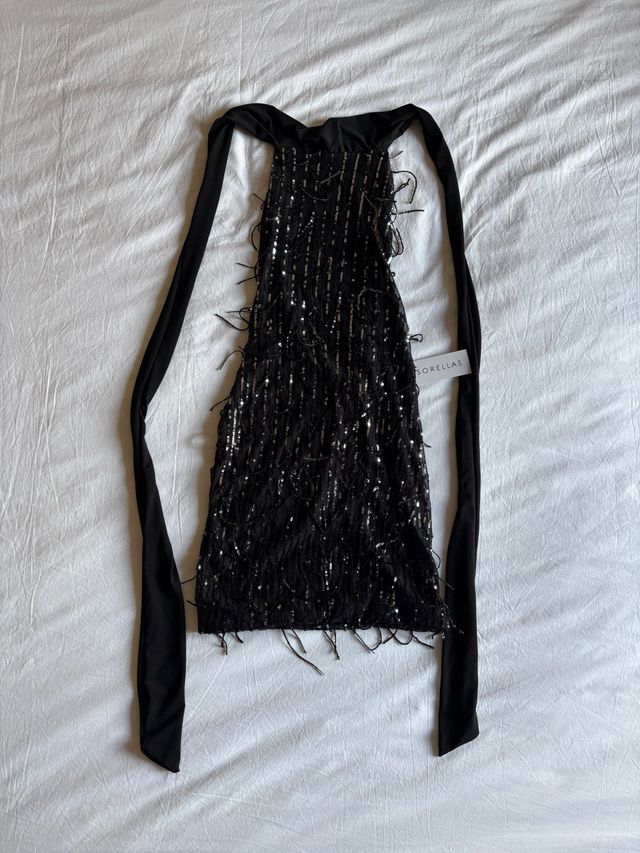 Mini abito glitter con frange nere e argento