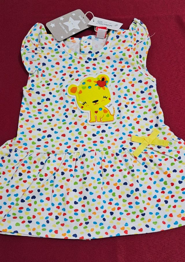 Dettagli del prodottoPrecioso vestido para bebé de la marca Tuc Tuc, talla 6-9 meses. Es de color blanco con estampado de corazones multicolores y un simpático aplique de un cachorro. Tiene un lazo amarillo en la cintura. - Perfecto estado. - Talla 6-9 meses. - 100% algodón (se asume por la apariencia). - Ideal para eventos especiales o uso diario.