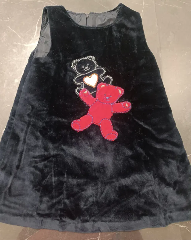 Dettagli del prodottoVestitino smanicato per bambina, taglia 2 anni. Realizzato in morbido velluto nero, presenta una simpatica applicazione di due orsetti con un cuore.
