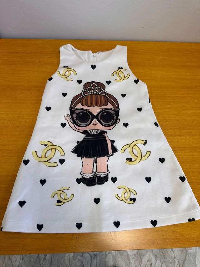 Grazioso vestitino per bambina, taglia 5 anni. - Fantasia con bambola stilizzata e cuoricini. - Dettagli con logo dorato. - Modello senza maniche.