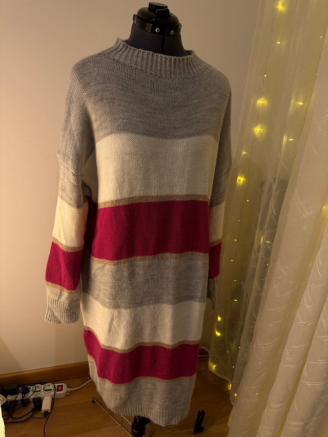Vestito a maglione a righe grigio e fucsia