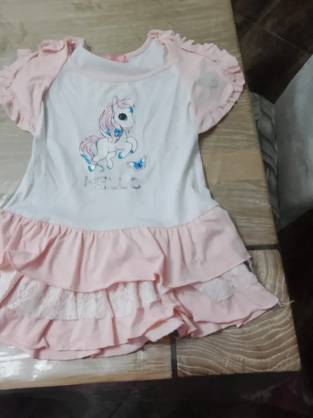 Grazioso vestito per bambina con stampa di unicorno e farfalle. - Colore bianco e rosa. - Maniche corte con volant. - Gonna a balze con inserti in pizzo.