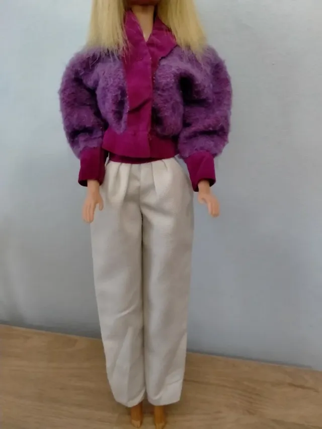 Dettagli del prodottoCompleto originale per Barbie #4480 dell'anno 1987. Include una giacca di lana viola bordata con velluto e pantaloni a vita alta color panna con pinces. Rarissimo. In ottime condizioni. La Barbie non è in vendita.