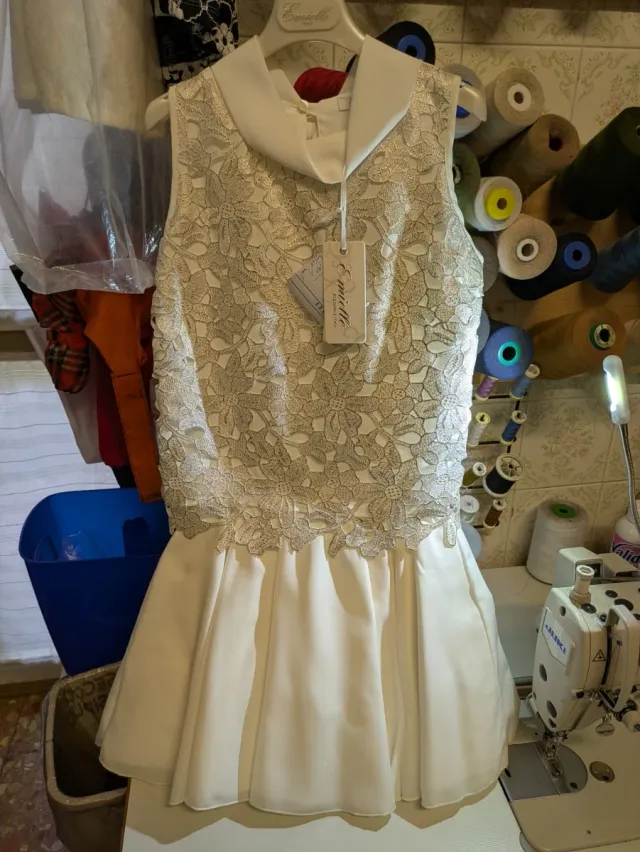 Elegante vestito da cerimonia per bambina di 10 anni. - Corpetto in pizzo floreale. - Gonna ampia in tessuto liscio. - Colletto bianco rigido.